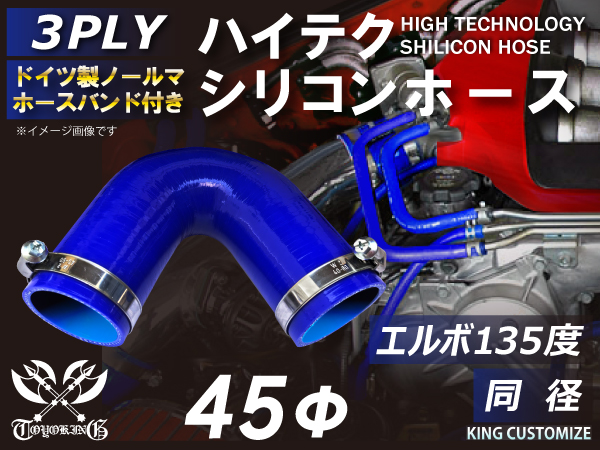 ホースバンド付 ハイテクシリコンホース エルボ135度 同径 内径Φ45mm 青色 片足長さ約90mm ロゴマーク無し 自動車工業 航空工業 港湾産業 化学工業 農業機械工業 各種工業用 耐熱 汎用品
